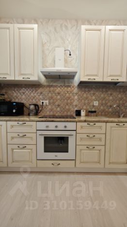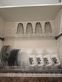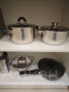В кухонной зоне: индукционная плита, холодильник, микроволновая печь, электрический чайник, комплект посуды, бокалы и кухонные принадлежности