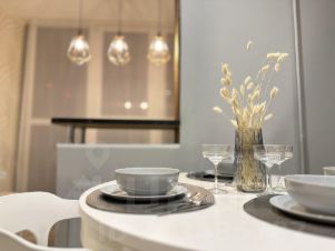 Квартира теплая и уютная, с дизайнерским ремонтом. Полный комплект посуды, постельного белья, мыльных принадлежностей. Хорошая шумоизоляция , парковка у дома, тихий зеленый двор с детской площадкой .