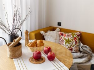 В комнате расположены двуспальная кровать с качественным ортопедическим матрасом и большой, уютный диван, телевизор со смарт-тв, прикроватные тумбочки. На кухне одноместный раскладной диванчик.