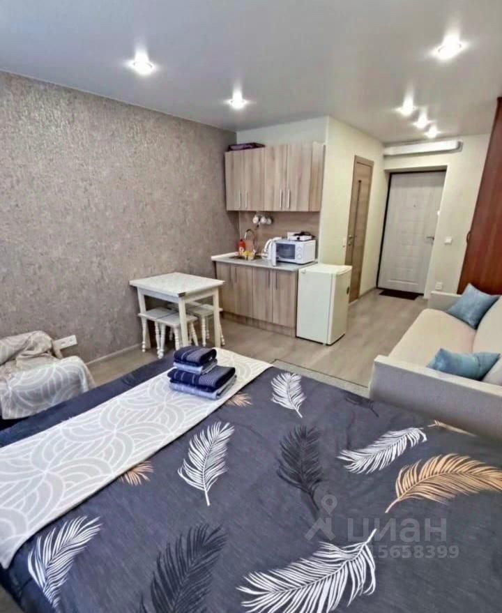 В квартире сделан евроремонт, благодаря чему она выглядит стильно и современно. Пространство студии грамотно организовано, здесь есть всё необходимое для комфортного проживания: кондиционер, холодильник, телевизор и стиральная машина. Интерьер оформлен в светлых тонах, что визуально увеличивает пространство и создаёт атмосферу уюта.