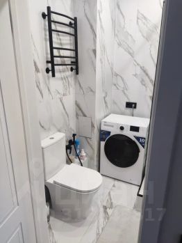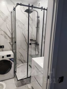 Санузел: Современная ванная комната с душевой кабиной и стиральной машиной.