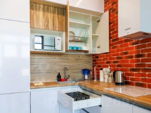 • Кухня с чайником, микроволновой печью, холодильником, посудомоечной и стиральной машинами.