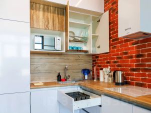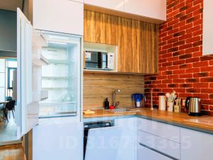 Кухня с чайником, микроволновой печью, холодильником, посудомоечной и стиральной машинами.