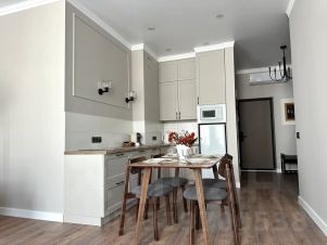 - Полностью оборудованная кухня с микроволновой печью, посудомоечной машиной, холодильником, индукционной варочной поверхностью, чайником, кухонными принадлежностями, а также вас ждет чай, кофе, сахар, соль, вода