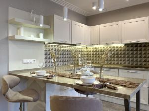 Оборудованная стильная кухня со встроенной техникой. Большая гардеробная.