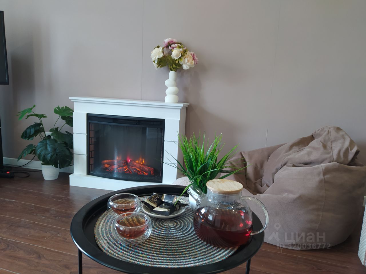Камин и бескаркасное кресло, второй телевизор с онлайн кинотеатром, кондиционер для дополнительного комфорта в зоне гостиной.