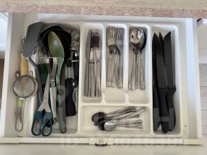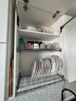 - На кухне холодильник, электрический чайник, обеденный стол и стулья, плита, вся необходимая посуда и столовые приборы, микроволновка.