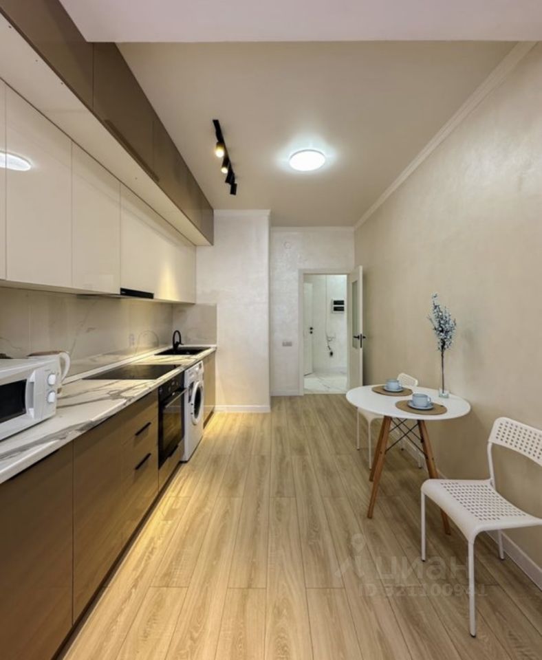 Внутри квартиры есть все необходимое для комфортного проживания. Просторная кухня оснащена всей необходимой мебелью и современной техникой, включая холодильник и кондиционер. В комнате также есть мебель, а для вашего удобства установлен телевизор. Совмещенный санузел включает в себя ванну и стиральную машину. На балконе приятно отдыхать в любое время года.