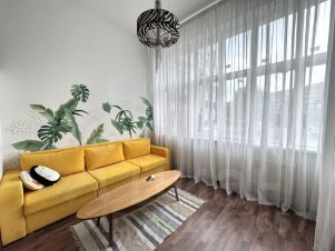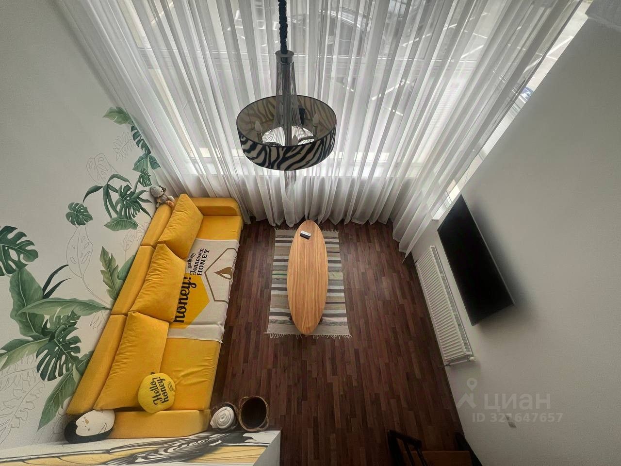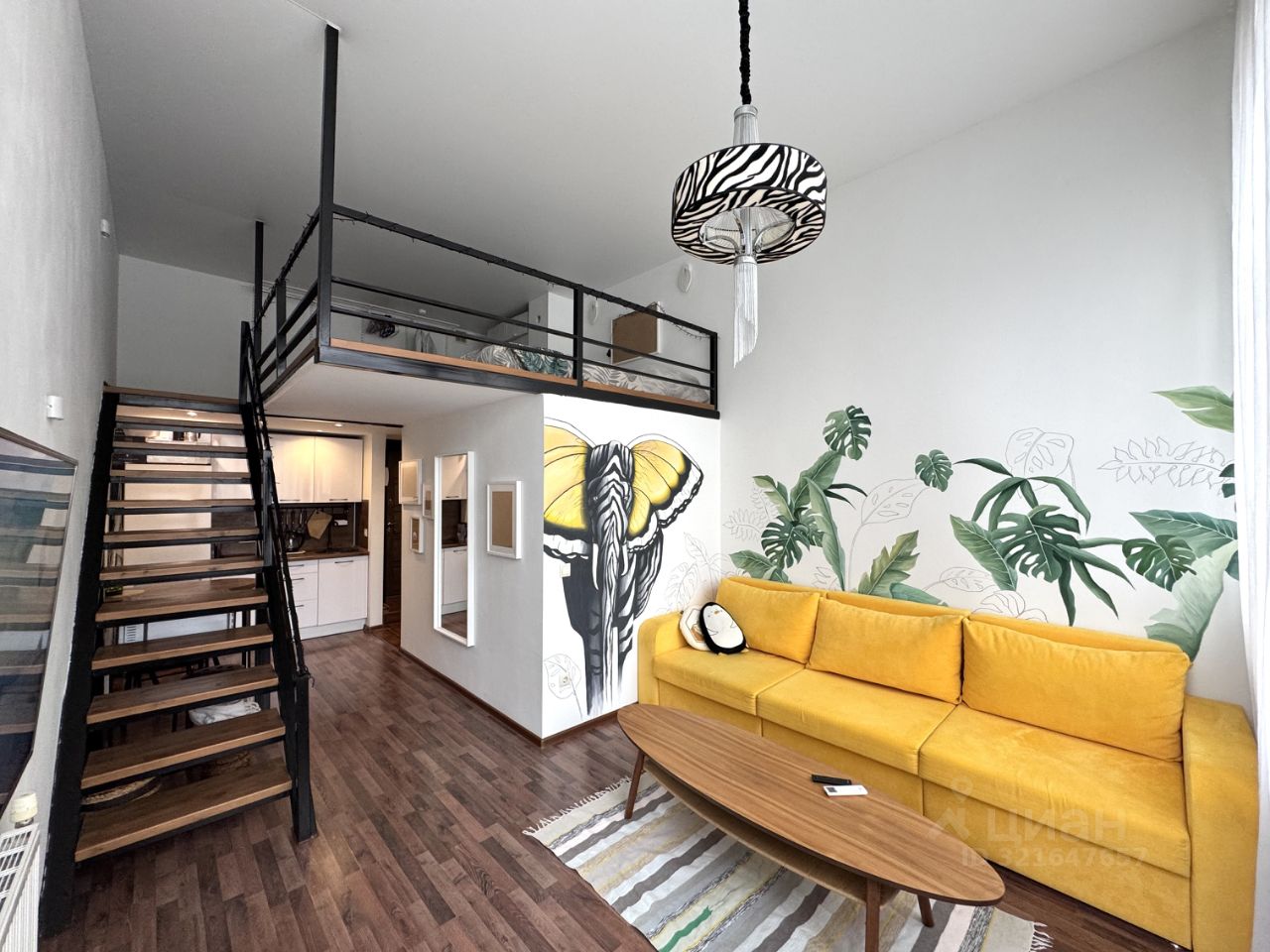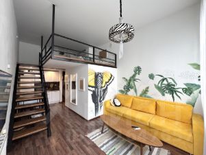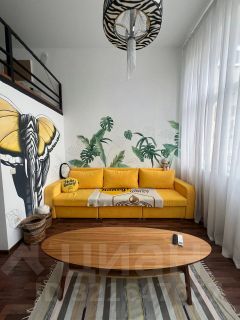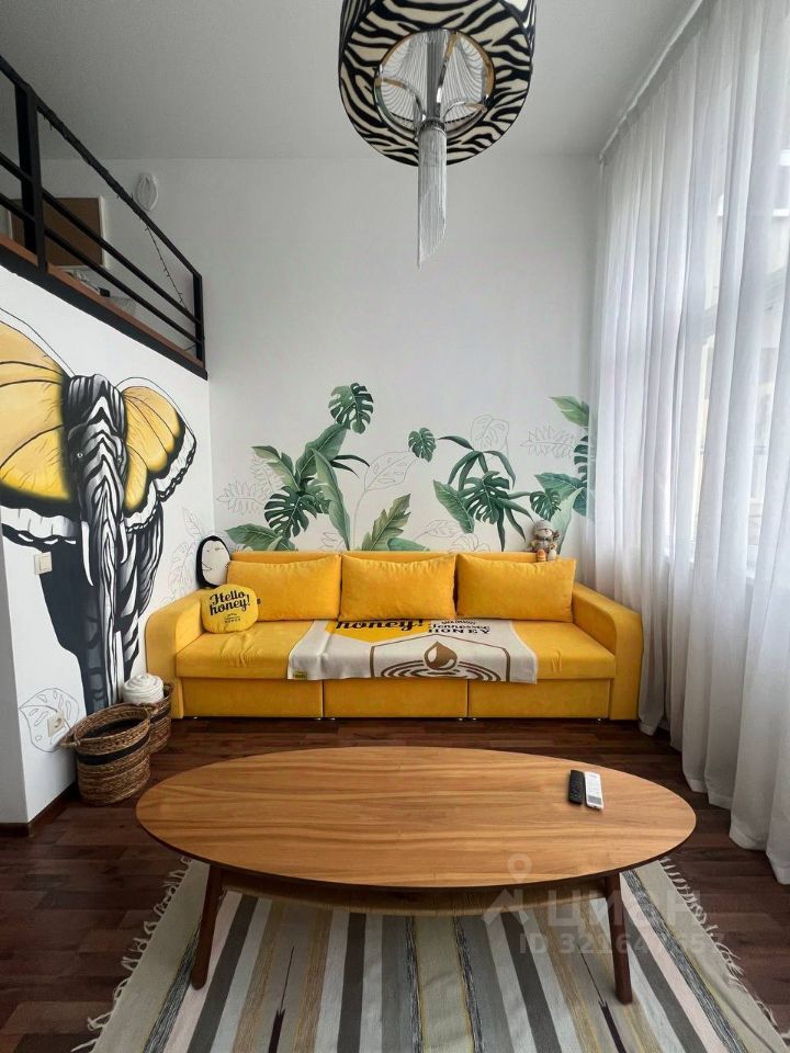 Просторная гостиная с ярким диваном,со вторым светом, четырехметровыми потолками и настенными росписями создает атмосферу уюта и вдохновения.