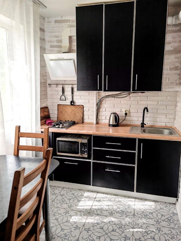 В квартире сделан косметический ремонт. Здесь есть вся необходимая мебель как на кухне, так и в комнате. Из техники в вашем распоряжении холодильник, телевизор и стиральная машина. Санузел совмещённый, в ванной комнате установлена ванна. Окна выходят во двор, поэтому в квартире тихо и спокойно.