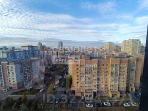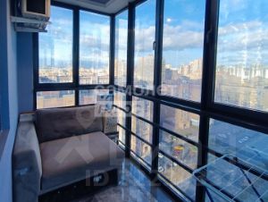 Большая затонированная от УФ-лучей и любопытных взглядов лоджия с панорамным остеклением и видом на Дворец водных видов спорта;