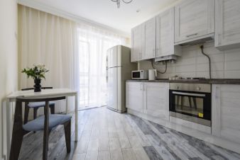 Полностью оборудованную кухню: чайник, плита, духовой шкаф, холодильник , микроволновая печь и всё необходимое для готовки.