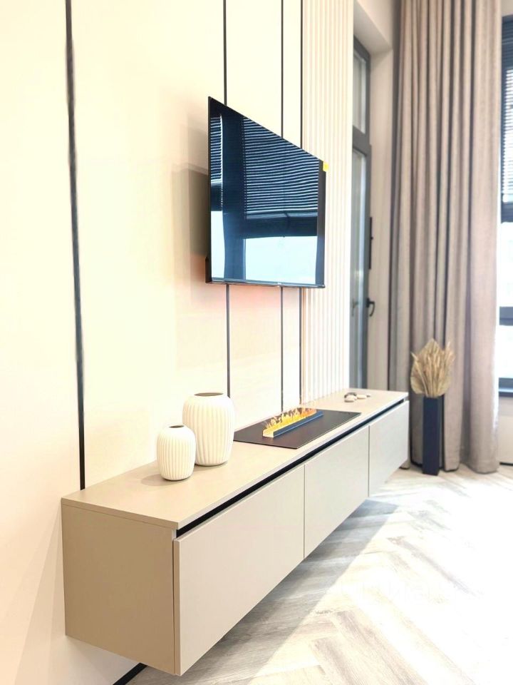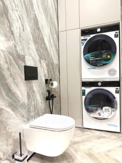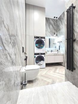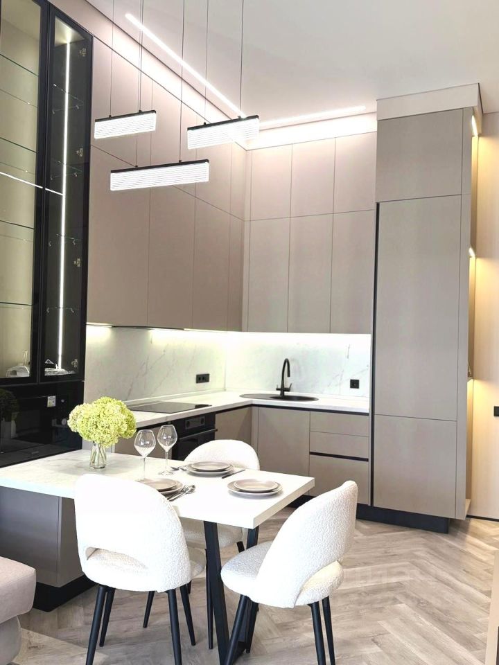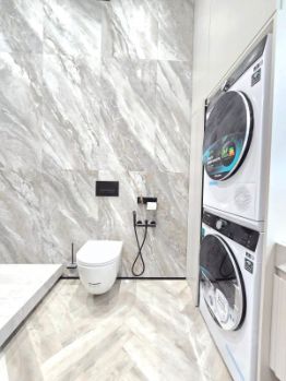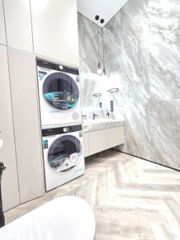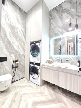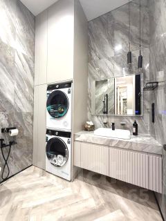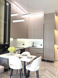 - Встроенная техника полного комплекта (холодильник, ПММ, микроволновая печь, варочная панель, духовой шкаф, вытяжка, стиральная и сушильная машины).