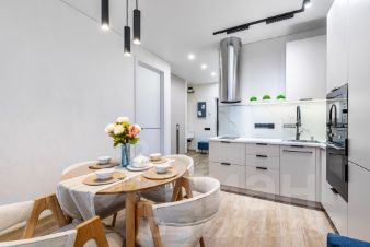 Полностью оборудованную кухню: чайник, плита, духовой шкаф, холодильник , микроволновая печь и всё необходимое для готовки.