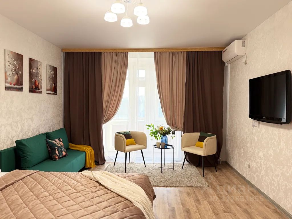 Уютная квартира с восхитительным видом на город ждет вас. Для ваших удобств большая двуспальная кровать(180*200) с ортопед матрасом, раскладной диван в комнате и раскладной диван на кухне, просторная ванная комната, квартира очень просторная и красивая, все привлекательные спортивные и развлекательные объекты в шаговой доступности. Рядом с домом очень много магазинов и кафе.