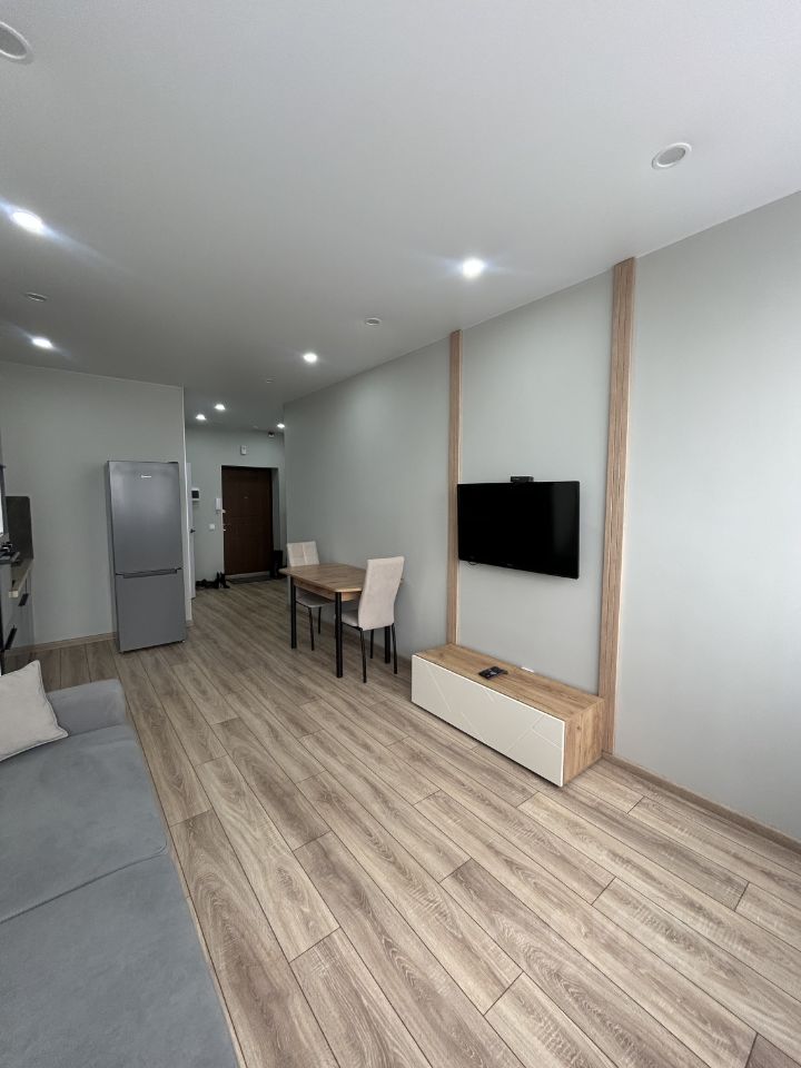 Квартира полностью готова для комфортного проживания. В кухне и комнате есть вся необходимая современная мебель. Установлена техника: кондиционер, холодильник, телевизор и стиральная машина. Санузел совмещённый, оборудован ванной. Балкон придаст дополнительное пространство для отдыха или хранения вещей.