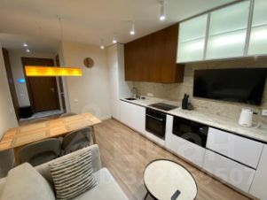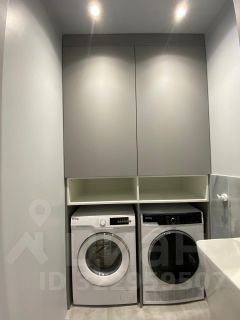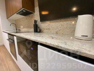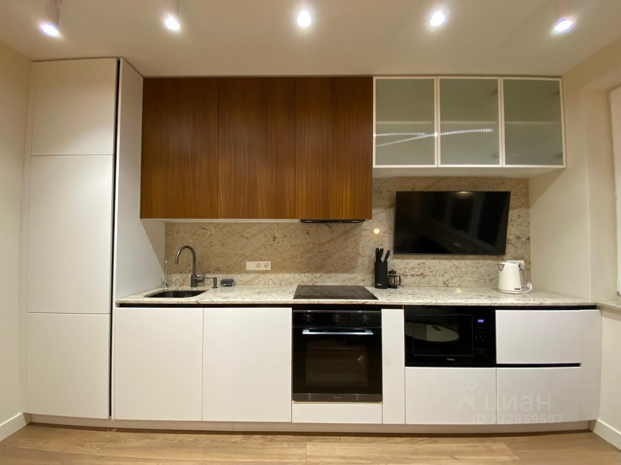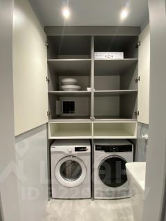 Стильный кухонный гарнитур, оснащён варочной панелью, духовым шкафом, вытяжкой, а также имеется посудомоечная машина, микроволновая печь, электрический чайник, двухкамерный холодильник, сушильная машина и стиральная машина;
