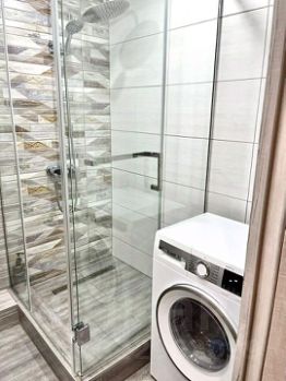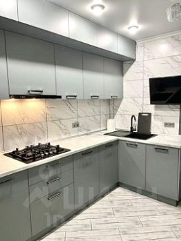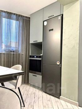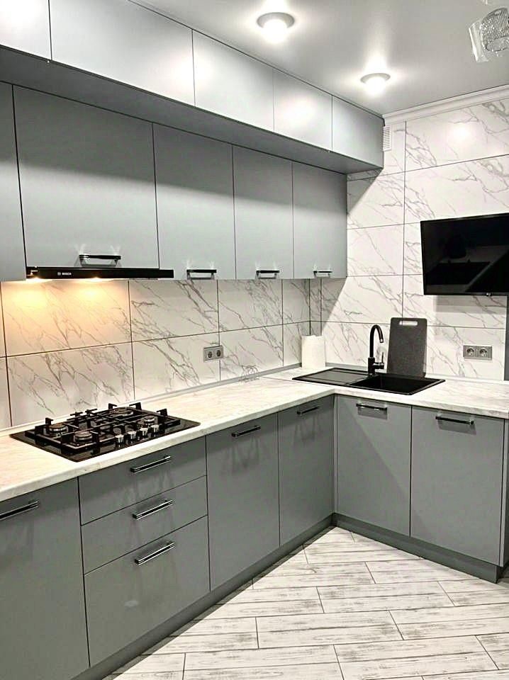 Стильный кухонный гарнитур, оснащён варочной панелью, духовым шкафом, вытяжкой, а также имеется посуда, микроволновая печь, электрический чайник, стиральная машина и двухкамерный холодильник;