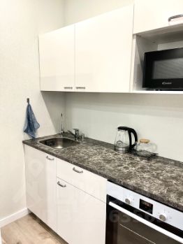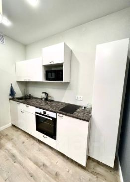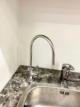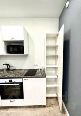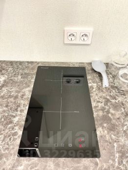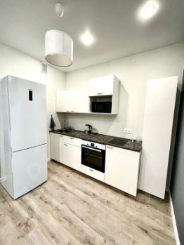 Стильный кухонный гарнитур, оснащён варочной панелью, духовым шкафом, а также имеется микроволновая печь, электрический чайник, посуда, дополнительно установлен кран с фильтрованной водой, стиральная машина и двухкамерный холодильник;
