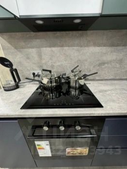 Стильный кухонный гарнитур, электрическая варочная панель, духовой шкаф, вытяжка, двухкамерный холодильник, посудомоечная машина, микроволновая печь, электрический чайник;