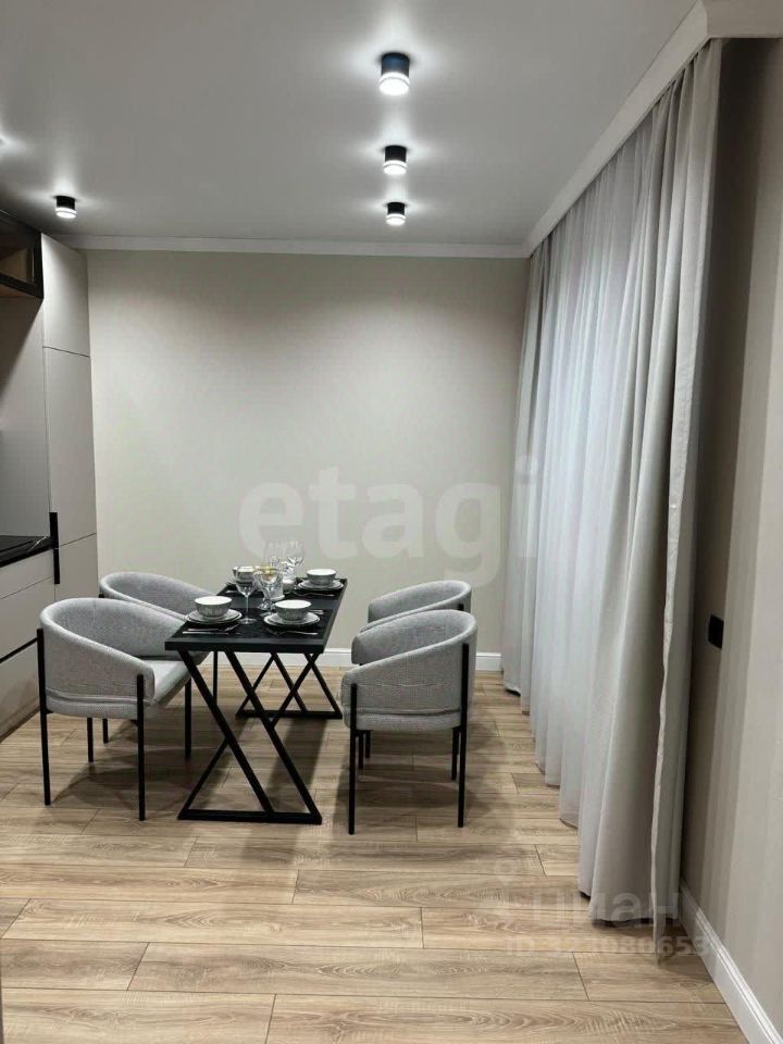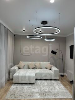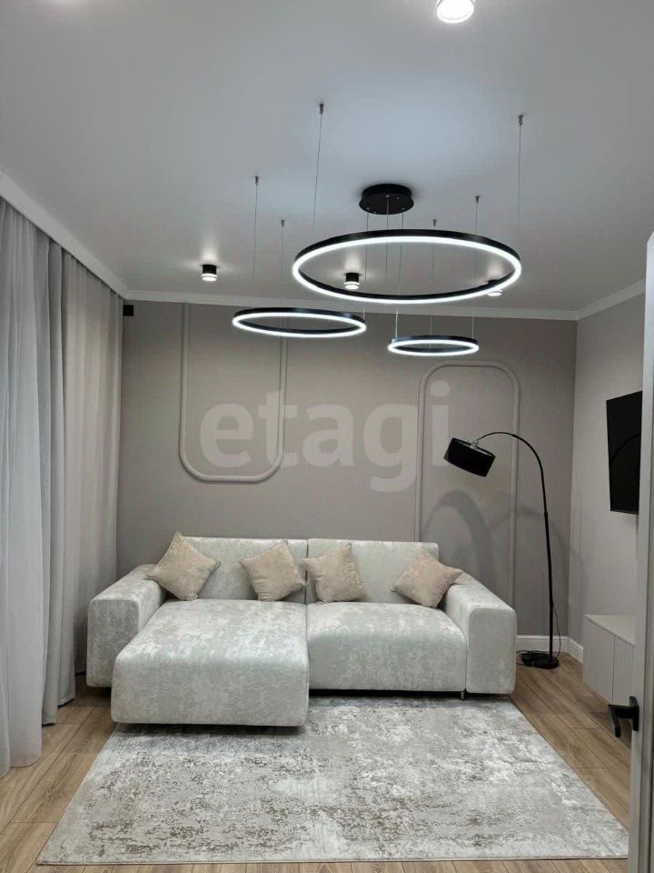 Просторная квартира сочетает в себе современный дизайн и функциональность. Здесь царит атмосфера уюта: мягкий диван, стильные кресла и оригинальные арт-объекты создают идеальное пространство для отдыха и встреч с друзьями.