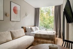 Просторные апартаменты для 4-х гостей на 2-м этаже гостевого дома с видом на улицу Низенькая. В номере есть ванная комната с душевой кабиной, двуспальная кровать, раскладной диван, телевизор и гардеробная. Кухонная зона с обеденным столом, который можно использовать в качестве рабочего.