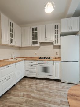 Кухонный гарнитур. Газовая варочная панель. Духовой шкаф электрический. 2х камерный холодильник. Новый стол и 4 табурета. Будет СВЧ печь при необходимости.
