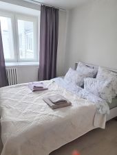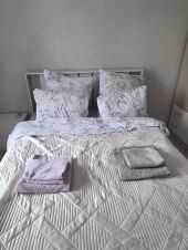 В 2х комнатах, в каждой, имеется 2х спальная кровать 140 * 200 см шириной, в большой комнате имеется 2х спальная кровать 160*200, всего 3 кровати. На кухне-столовой есть телевизор, и в 2х спальнях есть телевизоры. Также в каждой комнате есть шкаф для вещей, Постельное белье и постельные принадлежности входят в стоимость.