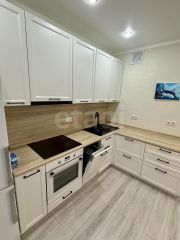 На кухне современный гарнитур с встроенной техникой.