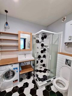 Санузел с душевой кабиной и тропическим душем . Стиральная машина , бойлер на случай отключения горячей воды.