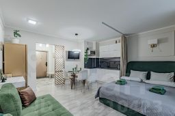 Полное оснащение: Студия оборудована всем необходимым для комфортного проживания: кондиционер, широкая двуспальная кровать (160х200) с ортопедическим матрасом и раскладывающийся диван, шкаф для одежды и прихожая с вешалкой, уютная лоджия с панорамными окнами и потрясающим видом на город. Функциональная кухня: холодильник, СВЧ-печь, электрическая плита, чайник и комплект посуды, водонагреватель, телевизор и высокоскоростной Wi-Fi. Гигиена и комфорт: средства гигиены, постельное белье, комплект полотенец. Дезинфицирующая уборка перед каждым заселением с использованием гипоаллергенных средств.