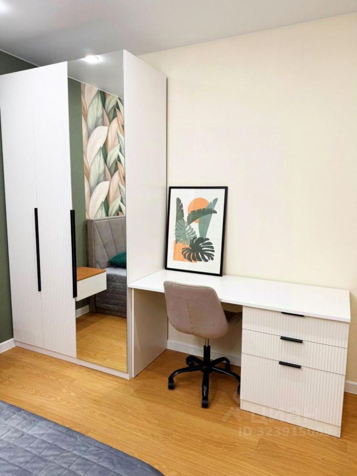 Просторная спальня с двуспальной кроватью, шкафом, тумбочками и рабочим местом (стол + стул).