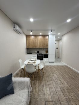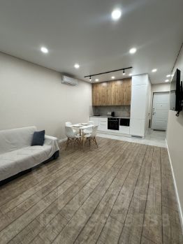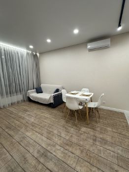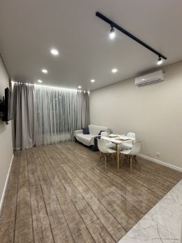 Квартира с дизайнерским ремонтом и полностью готова к комфортному проживанию. В наличии вся необходимая мебель: на кухне и в комнате. Из техники есть кондиционер, холодильник, телевизор и стиральная машина. В ванной комнате установлена современная душевая кабина. Балкон добавляет дополнительное пространство для отдыха.