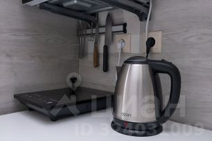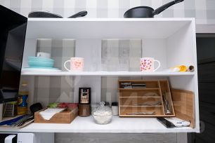 Пространство для приготовления пищи включает в себя микроволновую печь, холодильник, индукционную плиту, эл. Чайник и все необходимые столовые приборы. Также предусмотрено наличие бутилированной воды, чая и кофе.