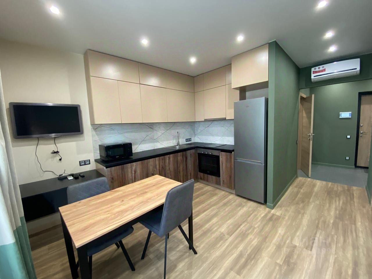 В квартире сделан дизайнерский ремонт, который придаёт пространству современный стиль и уют. Просторная студия полностью меблирована: есть мебель как в кухонной зоне, так и в жилой. Для вашего комфорта установлена вся необходимая техника: холодильник, стиральная и посудомоечная машины, телевизор и кондиционер. Совмещенный санузел оборудован душевой кабиной и ванной, чтобы вы могли выбирать, как расслабиться после долгого дня. Окна выходят во двор, поэтому в квартире тихо и спокойно.