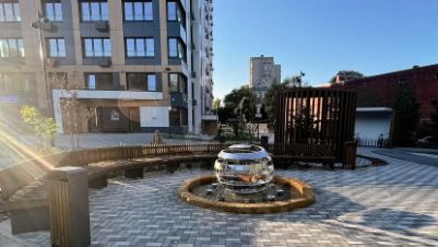 Ухоженная территория с летним фонтаном, беседками.