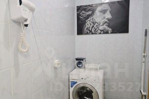 Сан узел с ванной, стиральной машинкой, фен, сушилкой для белья. Косметические средства, большое и маленькое полотенце для лица.