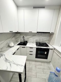 . В квартире установлен новый кондиционер, функциональная кухонная техника, включая духовой шкаф и газовую плиту, а также стиральная машина и холодильник.