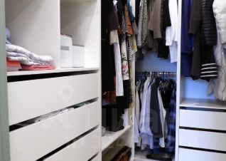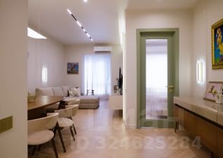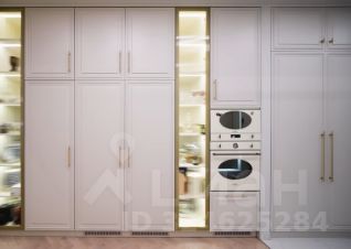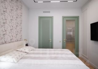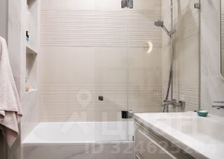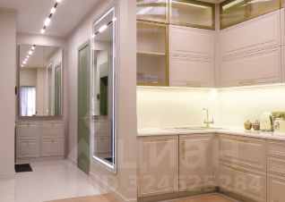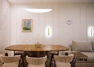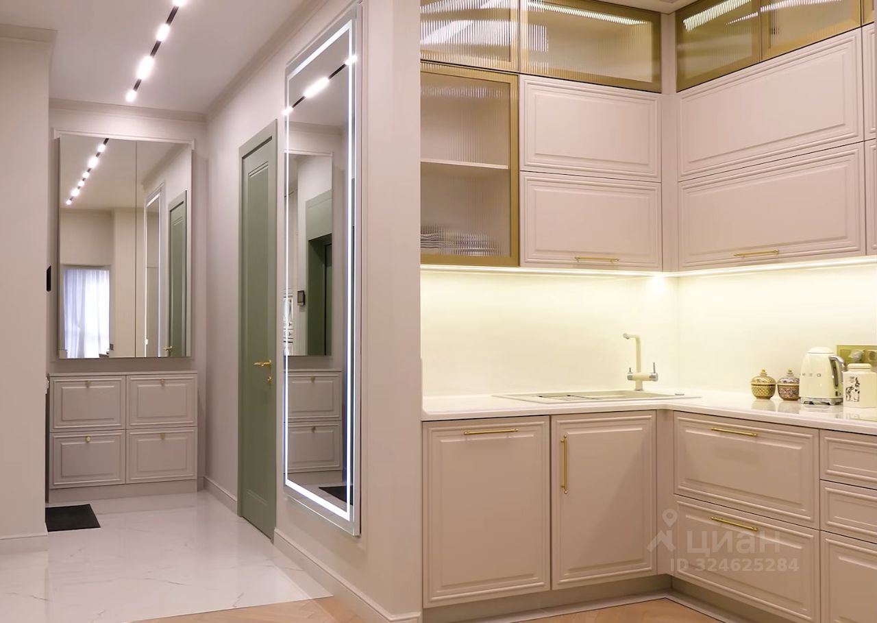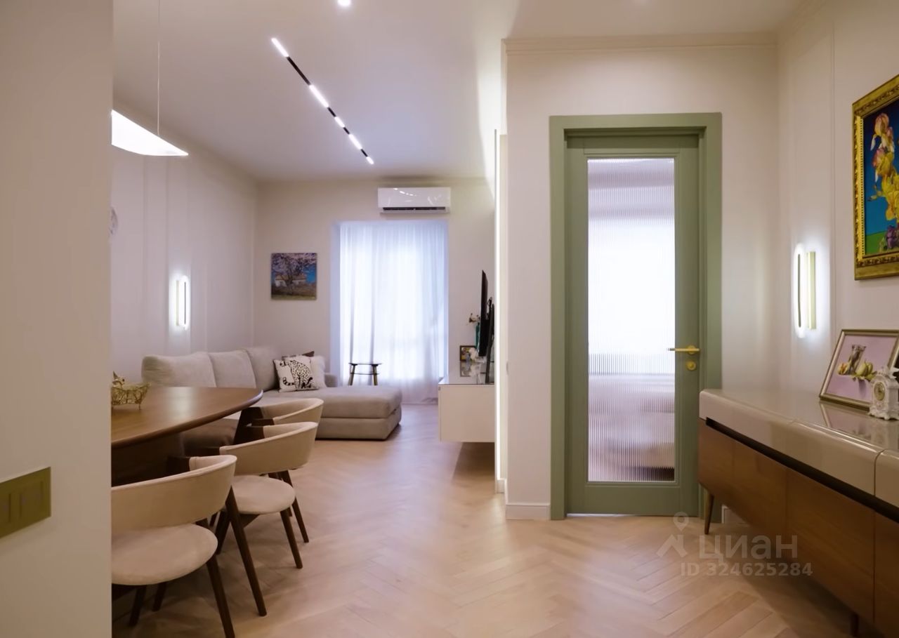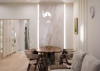 Освещение: Присутствует многоуровневое освещение, включая встроенную подсветку потолка, трековые светильники и настенный бра, что характерно для современного дизайна.