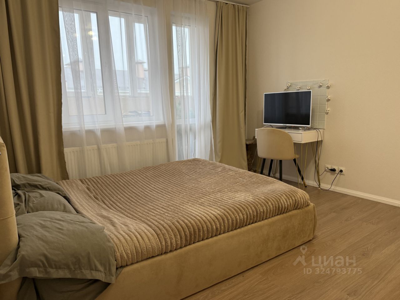 Большая кровать, новая мебель, кондиционер, рабочая зона — можно и спать, и работать, и существовать без мучений. Окно с легкими шторами добавляет воздуха.