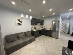 Квартира с продуманным ремонтом и современной мебелью. В гостиной можно комфортно разместиться на удобном диване, а в спальне уже есть вместительный шкаф и кровать. Кухня оборудована всей необходимой техникой, включая варочную панель, духовой шкаф и холодильник. Санузел совмещённый, в нём установлена ванна.