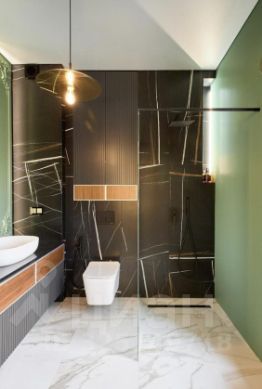 При входе в апартаменты Вы попадете в прихожую с большой зоной для хранения. Поднявшись по лестнице, перед Вами появится дверь в ванную комнату, где расположились просторная душевая кабина, зона для умывания с местами хранения и уютным освещением, и всеми необходимыми предметами гигиены, стиральной и сушильной машинками.
