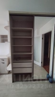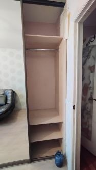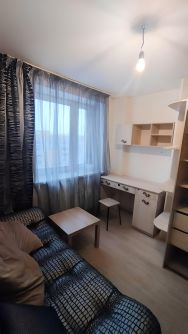 В комнате есть диван (раскладывается, боковые части так же подвижные), стол для учёбы/работы, навесной шкаф, шкаф-купе, маленький столик прикроватный