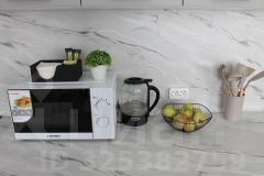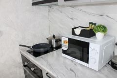 Кухонная зона оборудована холодильником, индукционной плитой, СВЧ печью, электрическим чайником и набором посуды.