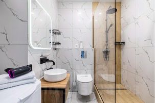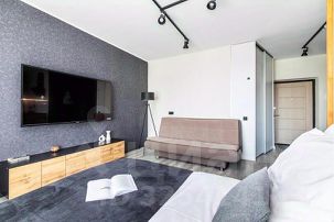 Спальня-гостиная - двуспальная кровать с ортопедическим матрасом, СМАРТ-ТВ, двуспальный диван, кондиционер, Wi-Fi интернет, набор подушек 70х70 и одеял, утюг, гладильная доска, сушилка для белья, фен и стиральная машина.