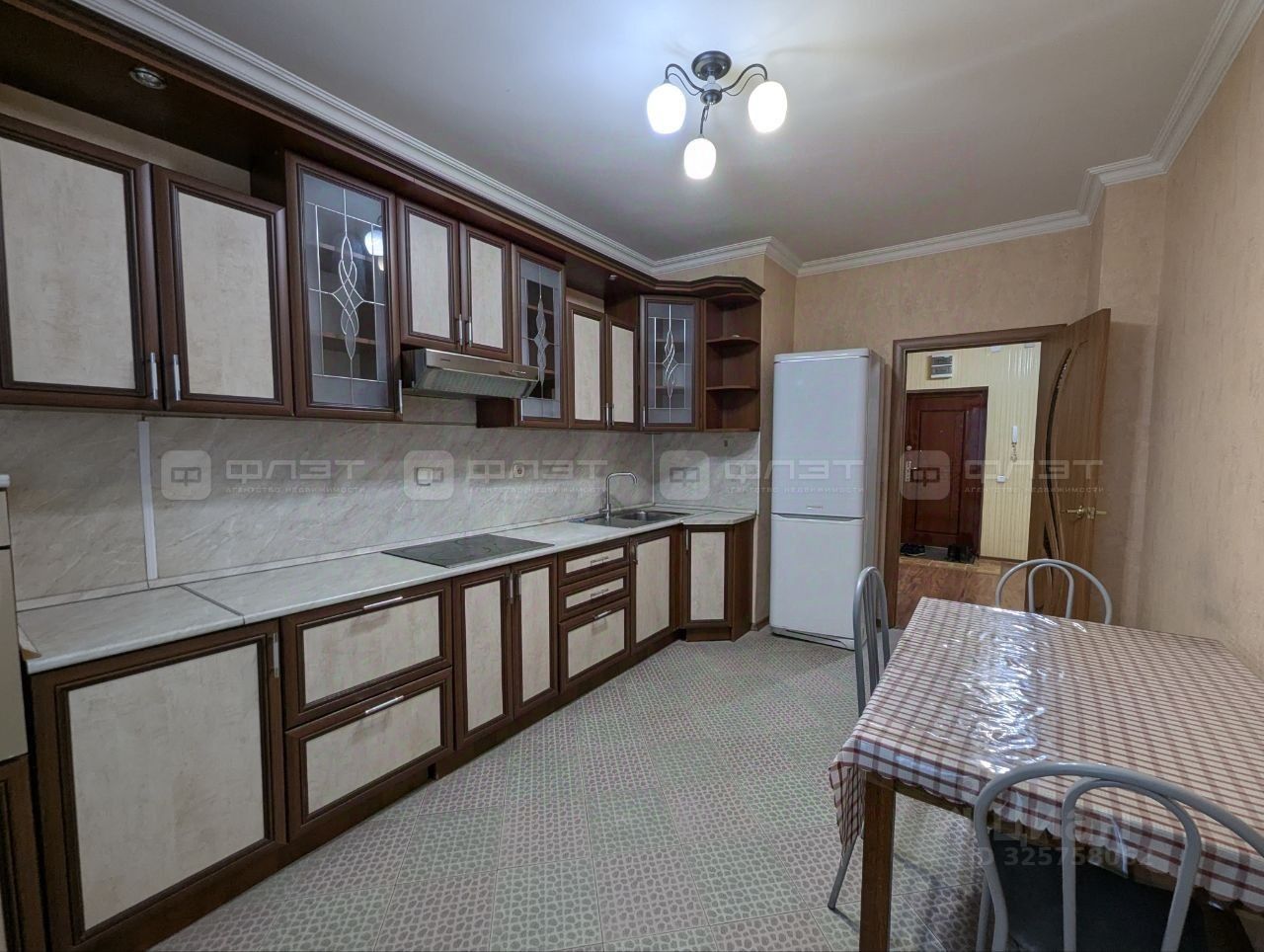 Квартира оснащена новой мебелью и техникой: кухонный гарнитур, диван раскладной, двуспальная кровать, шкаф-купе, cтол, стулья, холодильник, варочная панель, духовка, стиральная машина, ЖК телевизор.