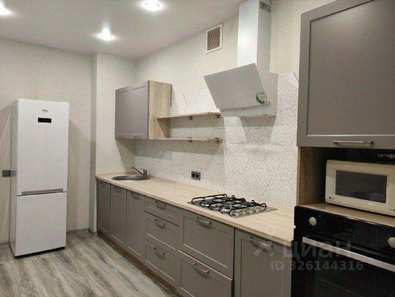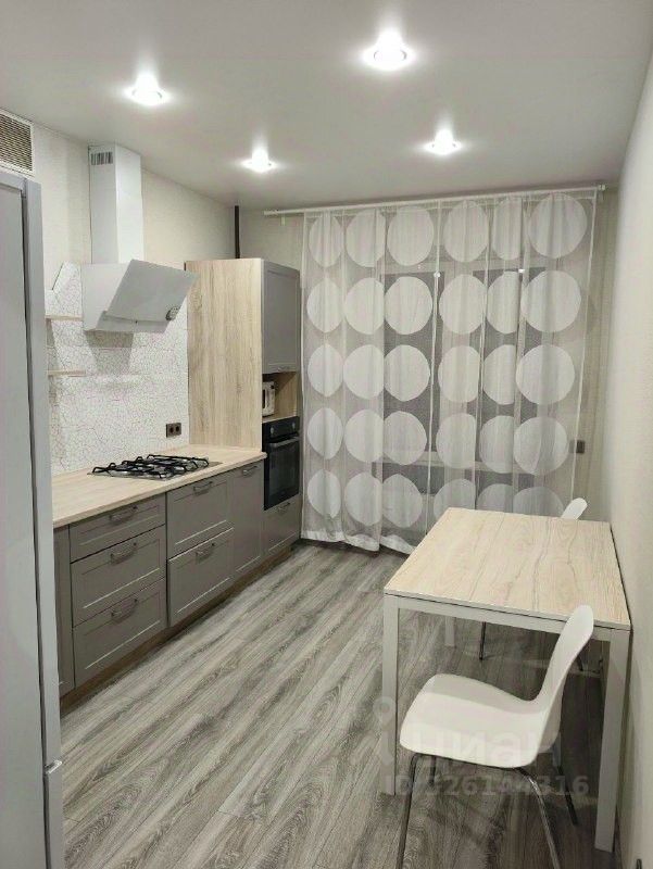 1) Кухня: кухонный гарнитур, холодильник, варочная панель (газовая), вытяжка, кухонный стол+стулья, посудомоечная машина, микроволновка, духовой шкаф, тюль.