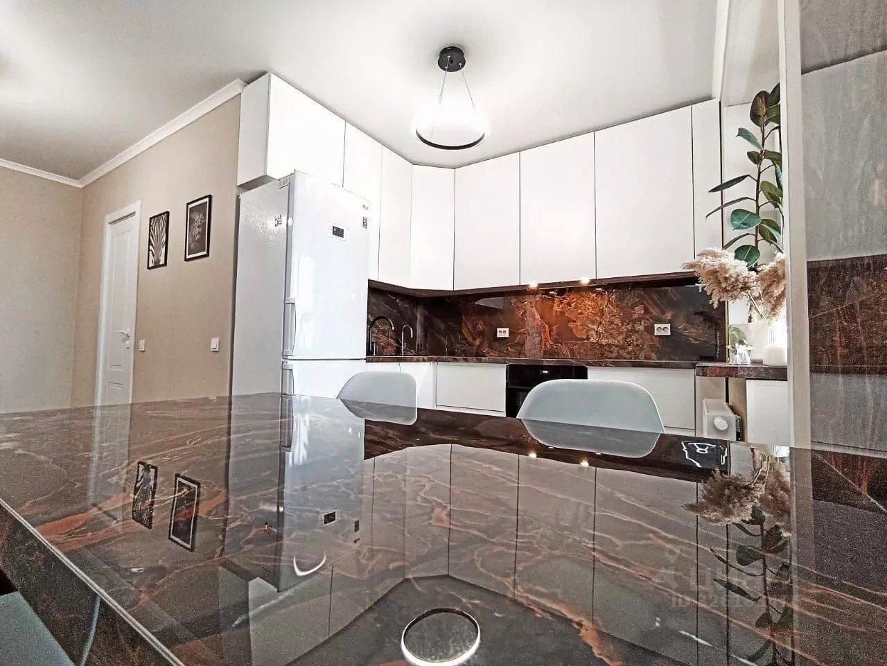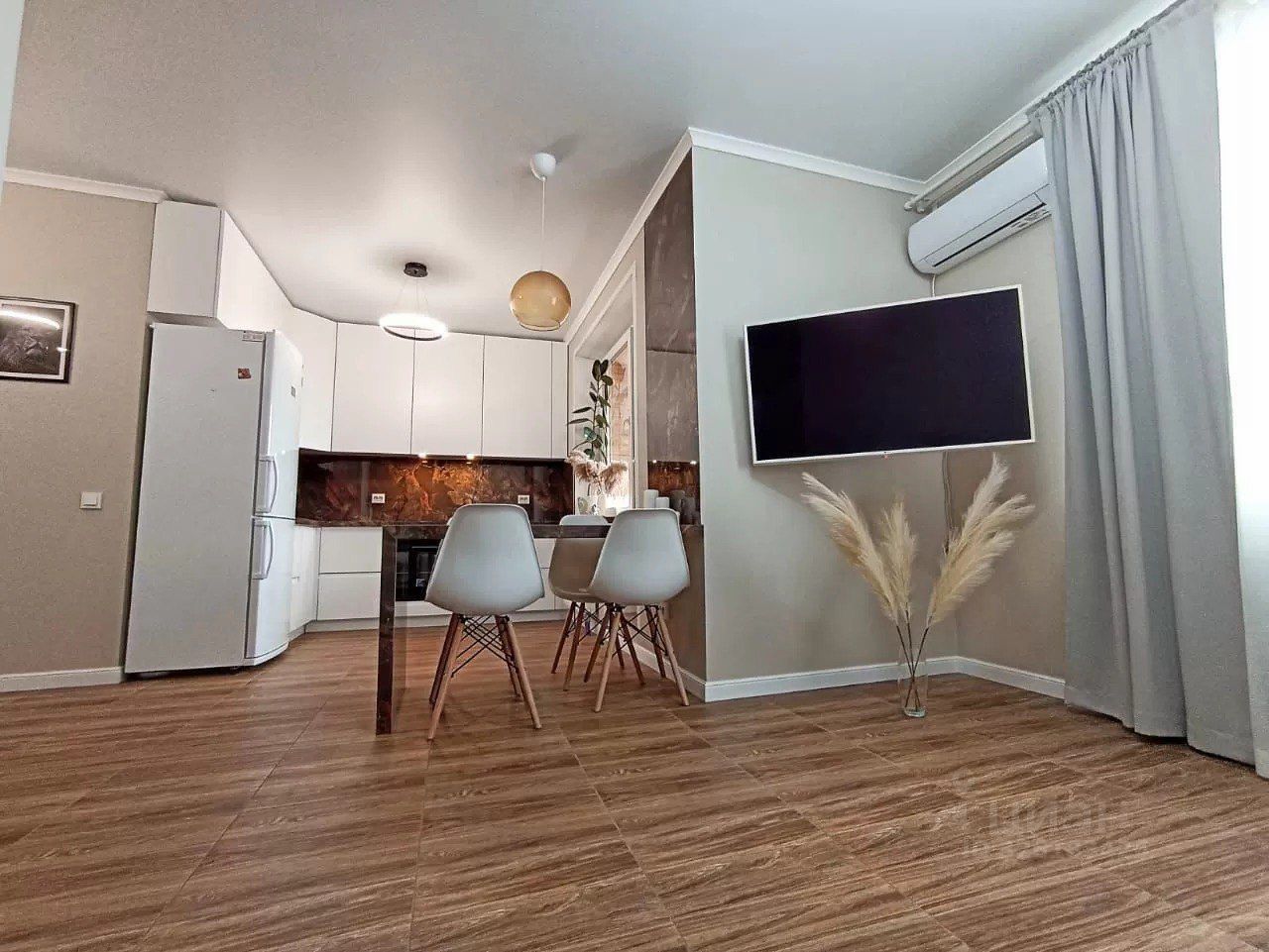 Квартира выполнена с дизайнерским ремонтом и полностью меблирована. В кухне и комнате есть необходимая мебель для комфортного проживания. В квартире установлена современная техника: кондиционер, холодильник, посудомоечная и стиральная машины, а также телевизор. Ванная комната оборудована душевой кабиной. Также имеется балкон, где можно отдохнуть и насладиться свежим воздухом.