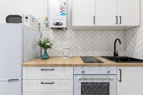 На кухне духовой шкаф, холодильник, свч-печь, водонагреватель, электрический чайник.