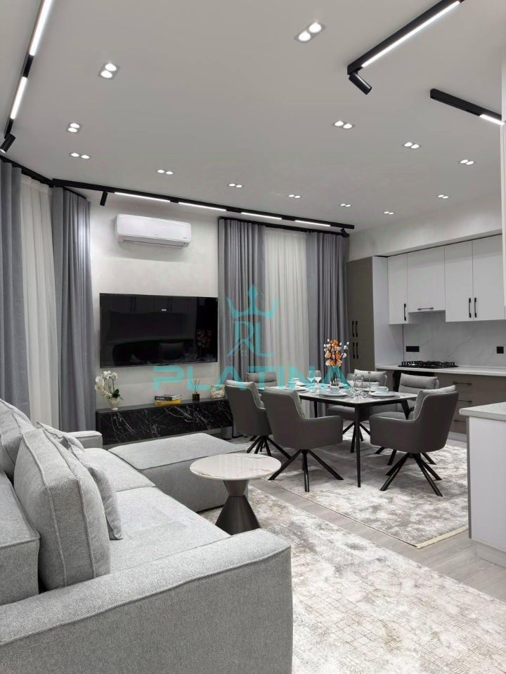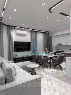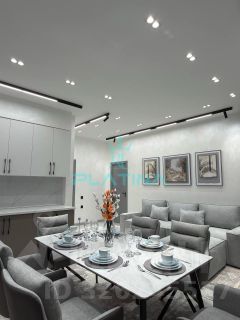 Просторная гостиная, объединённая с современной кухней, оснащена стильной мебелью премиум-класса и оборудована всей необходимой бытовой техникой, включая стильный холодильник, плиту с духовым шкафом и встроенную посудомоечную машину.